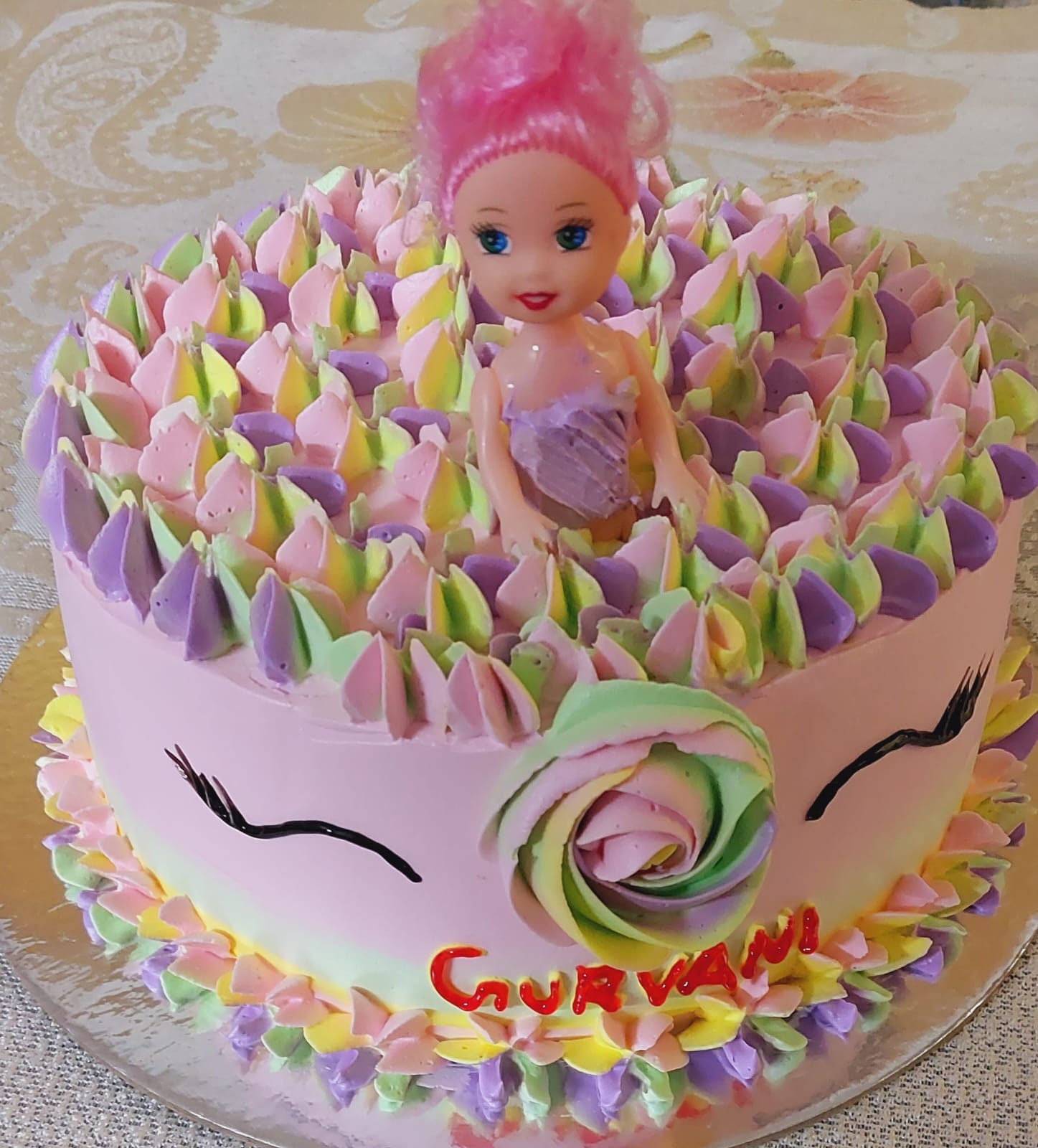 This round cake showcases pastel piping in a unicorn motif, with a doll inserted into the center. The cake is personalized with the name “Gurvani” in red and features closed eyes and a rainbow-like effect, ideal for a birthday or special occasion for a young child.